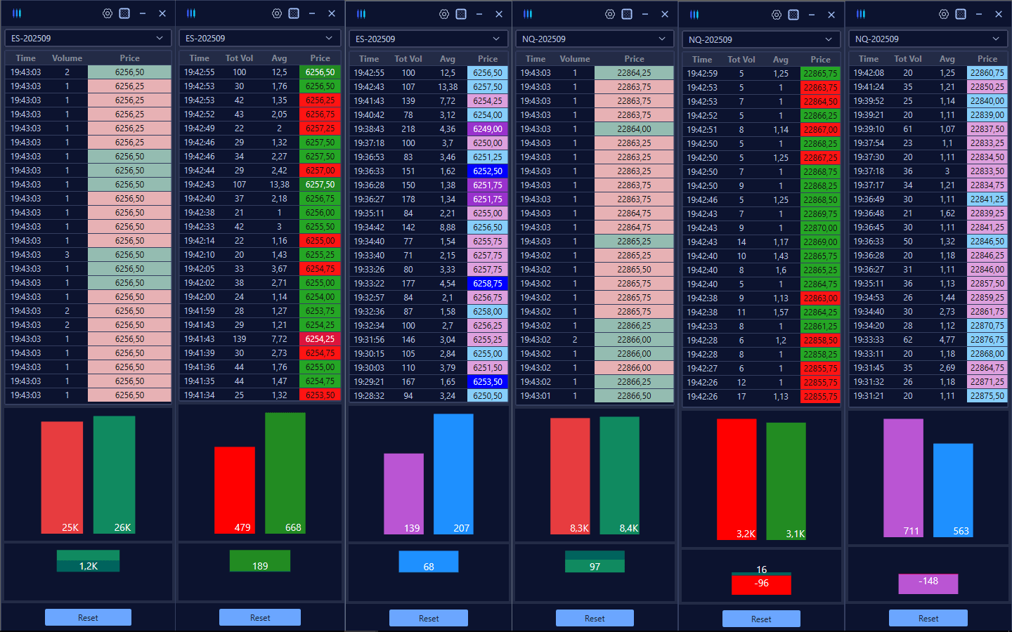 Volbook's Advanced Time & Sales (T&S), also known as Ticker Tape, is a key tool for monitoring real-time execution of market orders. It lists each transaction with timestamp, volume, and execution price.