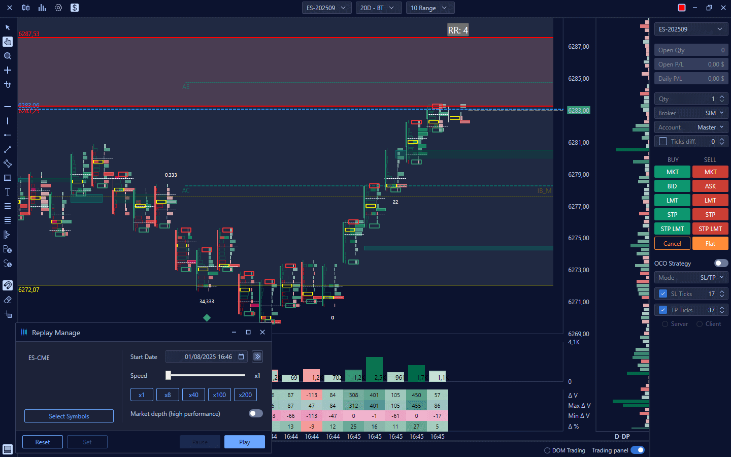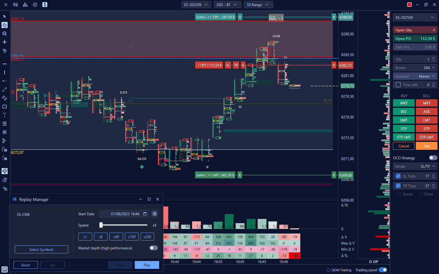 The Replay Tick Data feature allows you to relive past market sessions, tick by tick, simulating real-time observation. You can pause, rewind or speed up, controlling the time dynamics. It is great for executing trades in simulation, without risk. It is a useful tool both for beginners to familiarize themselves with order flow and for experts who want to test and refine strategies (discretionary backtest) in real scenarios, including high volatility. It also allows new instruments to be studied. At the end, a detailed report with statistics such as equity line, drawdown, percentage of winning trades, and risk/return ratio helps you objectively evaluate and improve your trading, building a solid and measurable approach to trading.