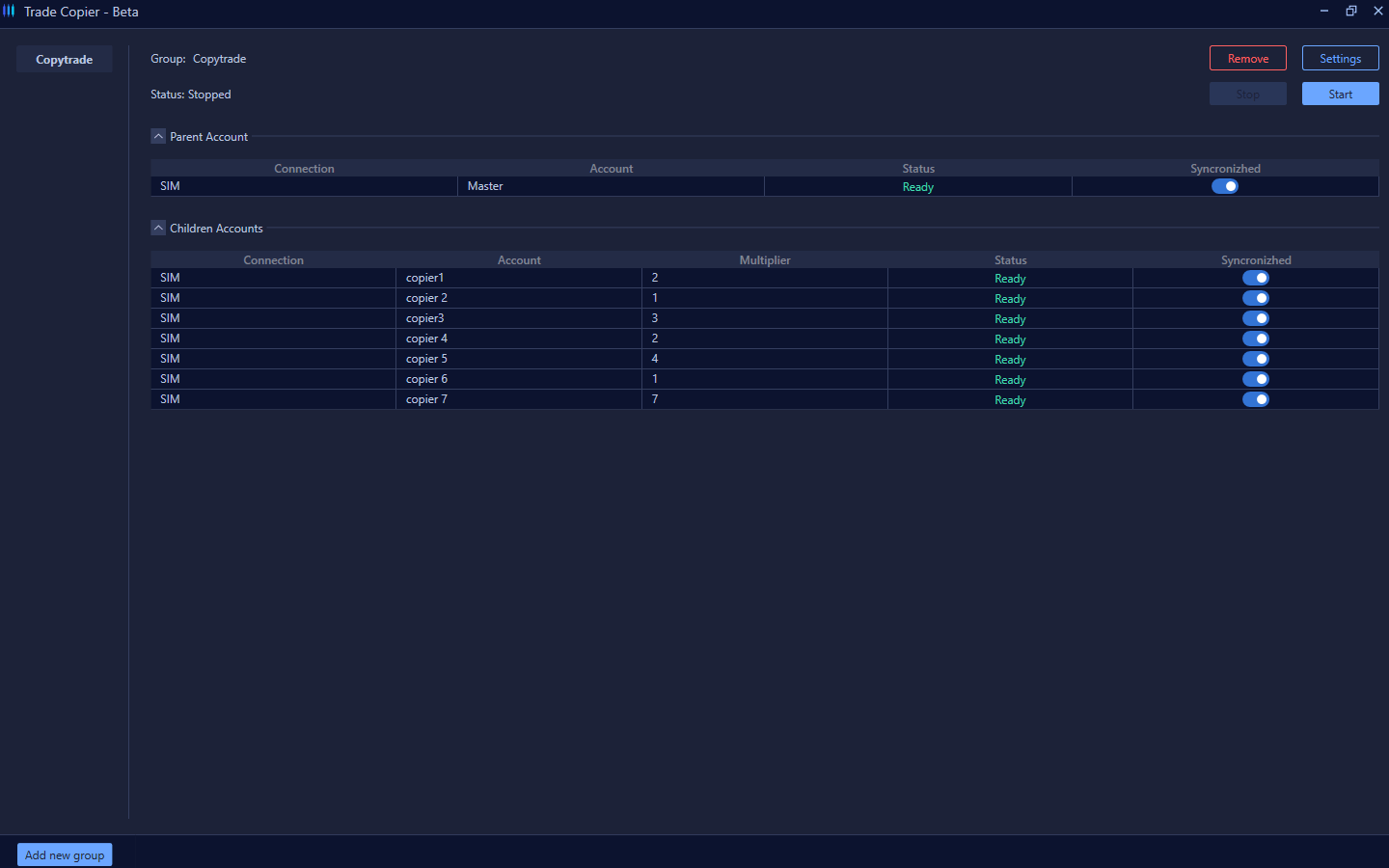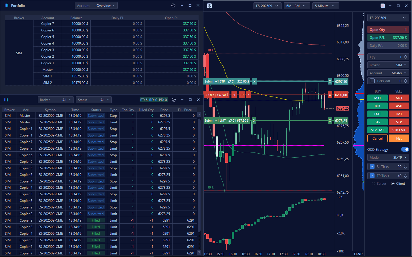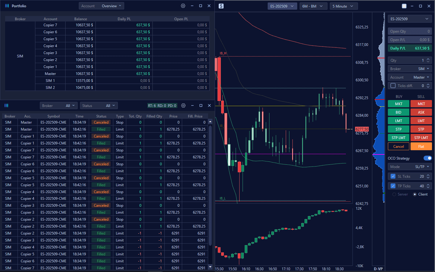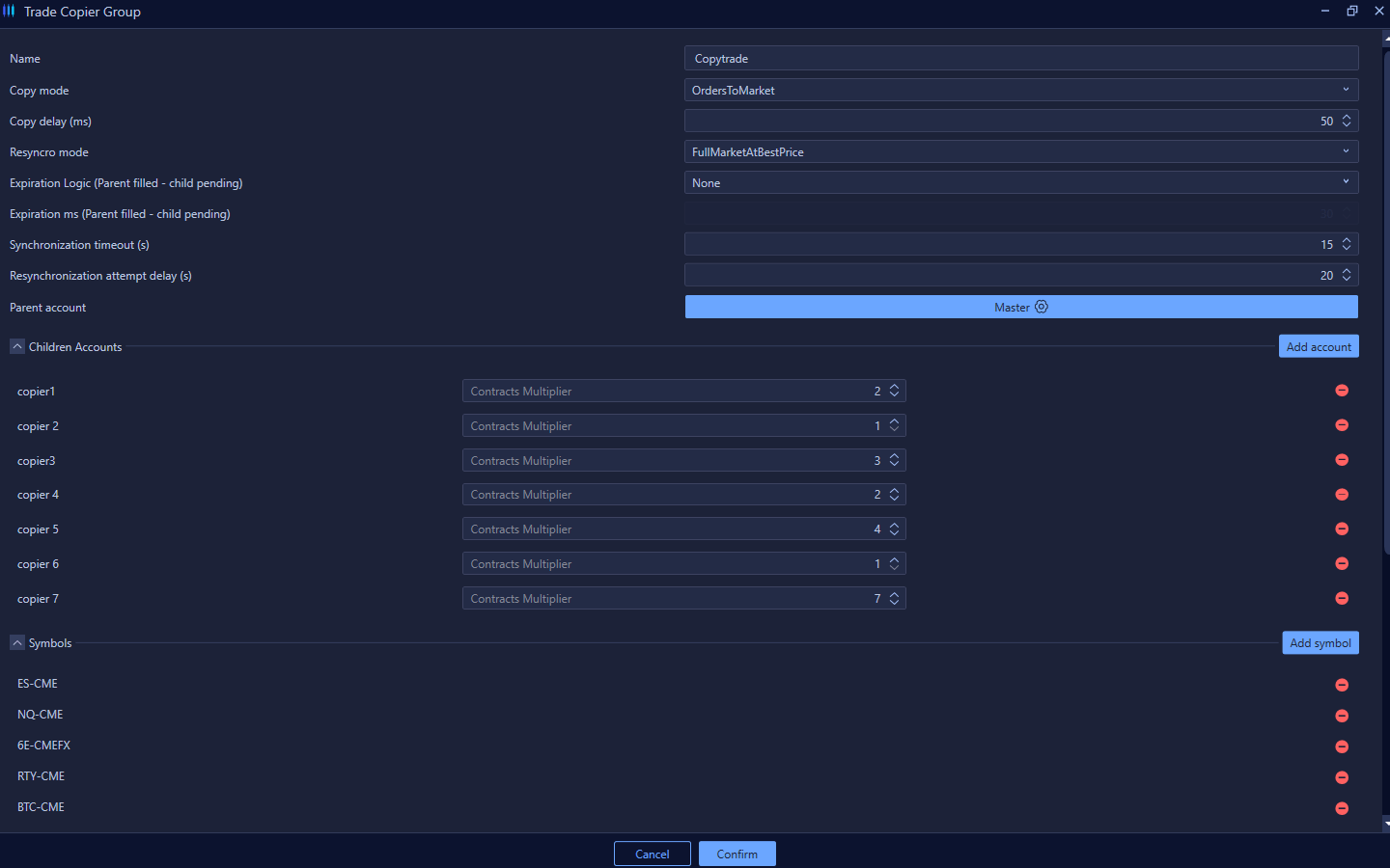 The Copy Trade feature of our platform allows you to automatically replicate trades made on a main (parent) account to one or more secondary (children) accounts. In this way, one account's trading strategies can be tracked in real time and applied synchronously to other accounts, maintaining operational consistency and saving time in management. One of the most advanced features of the system is the ability to set a multiplier, i.e., a volume multiplier: this allows, for example, to enter the parent account with 1 contract and replicate the same trade in the children accounts with 2, 3 or more contracts, depending on one's desired exposure. In this way, each account can adjust the position size according to its own capital, while still maintaining alignment with the strategy of the parent account.