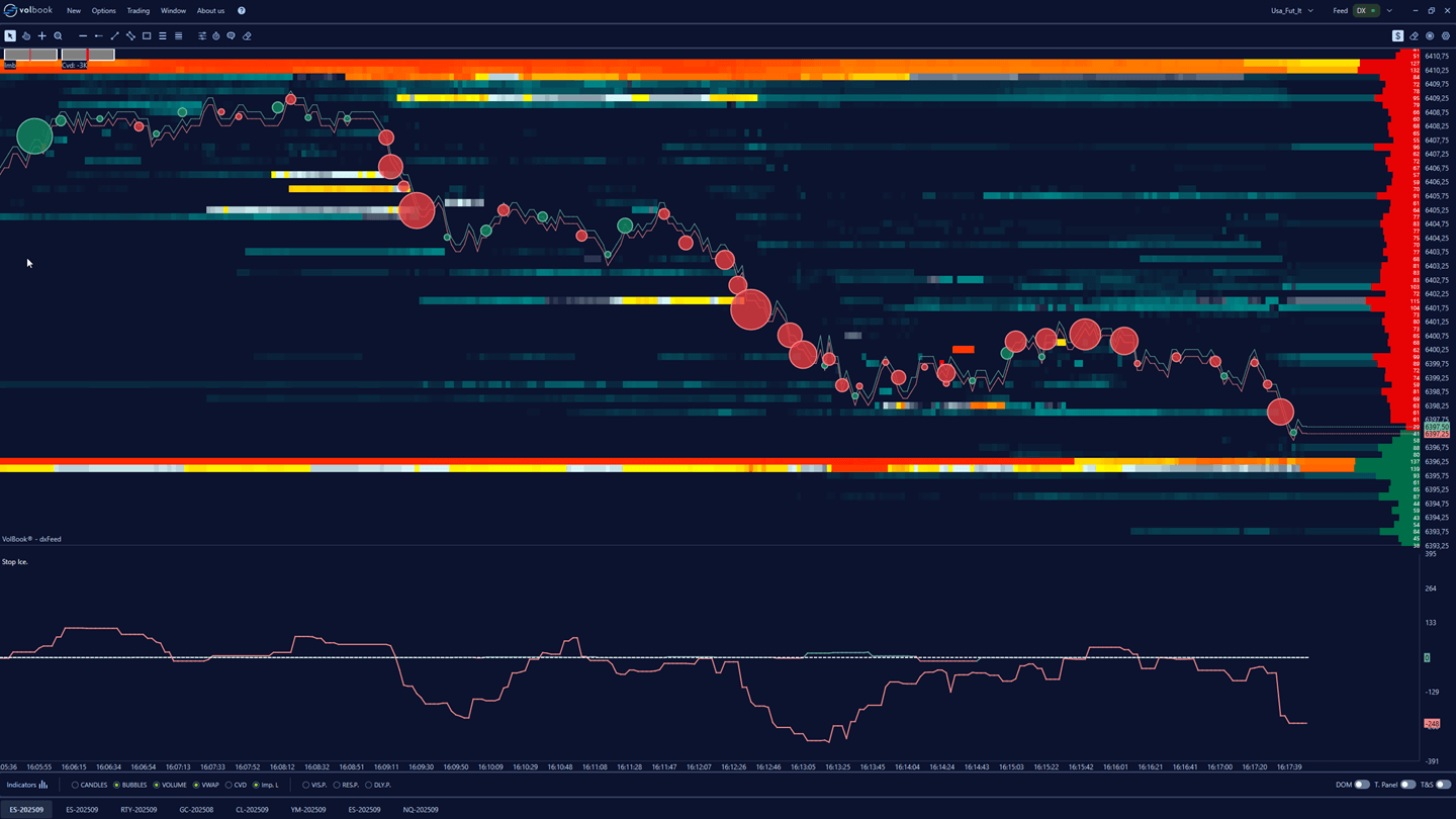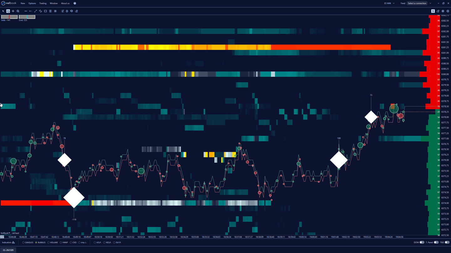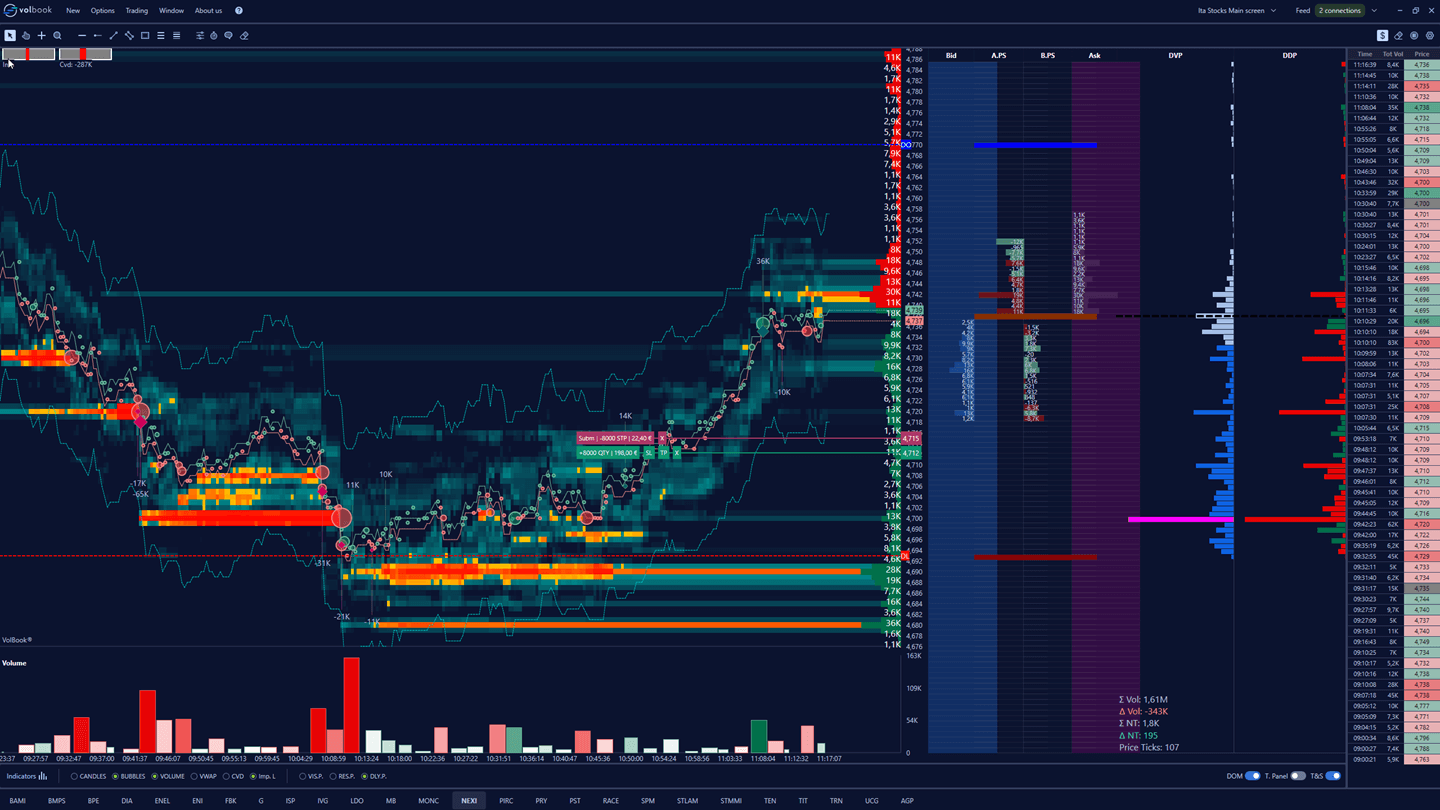 The VolAnalyzer is the ideal suite of proprietary indicators for those new to volume analysis. It simplifies the understanding of market dynamics by providing key information on fundamental volume actions such as Pressures, Absorptions, Accelerations and Exhaustions. A powerful tool for less experienced users, it opens the door to a deeper and more informed reading of the market.